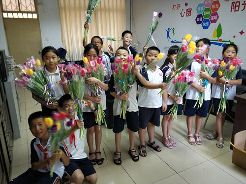 课间,学生们把亲手制作包装的手工花带上,向着老师的办公室奔跑出发,每个人都非常希望快一点把自己的心意通过今天传达给老师。李同学说“我今天好开心啊,希望老师收到花会很高兴。”;黄同学说“我要把最喜欢的颜色送给老师。”