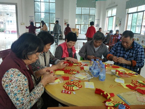 下午2:40老人都到达活动中心,帮老人量完血压之后活动就开始了。活动准备了两种类型的挂饰,老人们很认真地看完社工的示范之后,迫不及待开始动手制作挂饰。挂饰制作过程稍微有点复杂,但老人都很有信心把它做好。有位老人说:“这比打麻将好多了,还可以动动脑筋”,老人特别感谢社工的细心,提醒他们带上老花镜,不然的话就很难做得这么漂亮了。