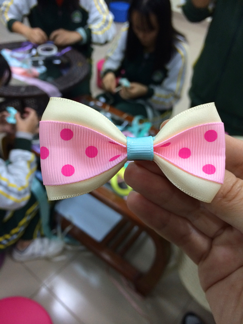 活动现场,社工以“美丽”为引导,带领参与者发现心中的“美丽”,并以制作头饰的形式展现出来。随后,学生们挑选自己喜欢的丝带后便开始专心制作属于她们独一无二的头饰。学生动手热情高涨,时而思考如何搭配丝带颜色比较好,时而用丝带折出别致的图案。制作过程中社工和志愿者在旁协助,参与者相互帮忙和支持,积极分享自己的作品。1个小时后,一个个各具特色的头饰陆续呈现在我们眼前。