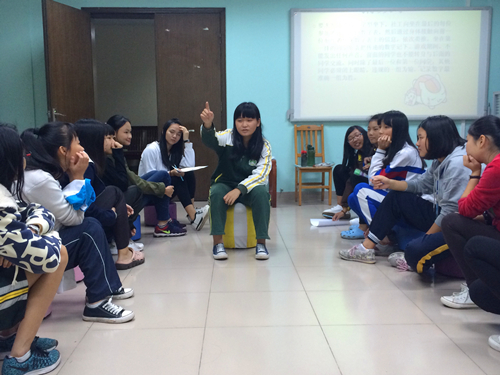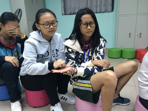 活动开场,社工一改自我介绍的环节,而是要她们介绍在手工社认识的朋友,学生们踊跃举手介绍自己认识的新朋友,有的说:“我介绍的是XXX,她很喜欢玩乐器。”有的说:“我喜欢XXX,因为她是一个话唠,跟她在一起总有说不完的话,感觉很开心。”随后社工把组员分成4组,带领她们玩“你画我猜”、“传数字”游戏,游戏中,她们充分发挥团队合作精神,根据每个人的性格特点分配任务,通力合作完成2项游戏。