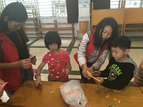 小朋友在志愿者的一对一辅导功课后,社工组织开展了“让纸活起来”的主题活动。志愿者和小朋友分成6组,利用准备好的卡纸、剪刀、水彩笔等材料进行纸手工创作。小朋友在志愿者的帮助下,将彩色卡纸剪成形状各异的图案,或将彩色卡纸折成不同的动物和物品。半小时后,在彼此的共同努力下,一个个富有创意的纸手工作品就完成了。小朋友和志愿者的创作使单调的卡纸“活”起来了。