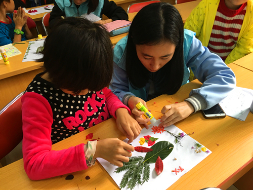 学生在志愿者的辅导下完成作业后,带着些许期待,活动正式开始了。志愿者首先向大家讲解了树叶画的制作过程以及美妙之处,激发学生参与的兴趣。随即让学生自己挑选合适的叶子进行构思和创作,经过学生对树叶的剪切、摆设、黏贴,一幅幅生动的画面呈现在大家面前,有海底世界、人物头像、森林奇观等等,大家都惊叹孩子的创意,对作品称赞不已。