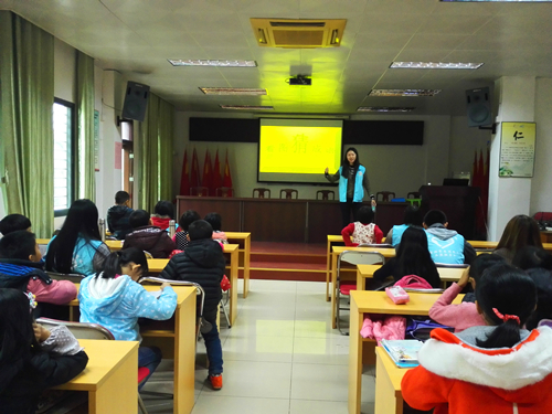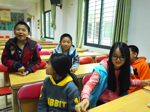 在学生认真完成作业,志愿者耐心辅导后,精彩的活动开始了。活动以“击鼓传花”的形式进行,当音乐停止后,谁接到水瓶的就有机会猜成语。每当听到音乐响起,大家都显得非常紧张,却又异常欢乐。“停了、停了、到你了...”学生高兴地说着。孩子们看着屏幕上的图画不停地思考,除了要猜出图片表达的成语外,还要说出成语的意思。很多孩子们都做到了。在给出答案后大家纷纷拿起笔记录下来。猜不到的学生也欣然接受“走猫步”、“屁股写字”、“仰天长笑”等等的惩罚。在笑声中活动获得了完满的成功。