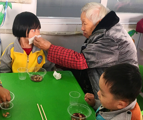 活动初始,幼儿园的师生带长者参观幼儿园,一路上幼儿园的小朋友们看到长者都很有礼貌地主动向长者问好、挥手,长者们不停地赞扬“小朋友真棒”“小宝贝真乖”“幼儿园真漂亮”。接着老人与小朋友一起参加升旗仪式,一起听故事,一起分豆子,一起玩篮球小游戏,一张张老少互动、互助的画面很自然地显现出来。