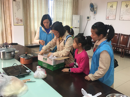 活动分为两个环节。第一个环节,社工和亲子志愿者一起制作番薯糖水。制作过程中,社工和志愿者们齐心协力,有的人将番薯洗干净、去皮并切成块状,有的人将糯米粉加温水糅合,儿童志愿者虽然年龄比较小,但是都十分积极融入到汤圆制作中,将揉好的糯米粉搓成一个个小汤圆。经过半个小时左右的烹煮,一锅香甜的番薯汤圆糖水就煲好了,稍微放凉后,社工和志愿者一起将其用一次性碗打包好。