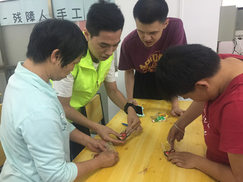 最后社工教导组员将义卖品打包装,贴标签,将义卖品一一摆放,进行义卖现场的模拟,由社工和志愿者扮演购买者,让组员推销自己的作品,培养个人的对话销售能力。