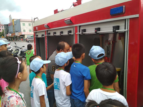 讲座结束后,就是参观消防车环节。在社区门前,消防员叔叔们指导学员们参观了消防车。消防员叔叔打开车上的一扇扇小门,给大家介绍了消防车上的小秘密:消防器械、高压水枪、氧气瓶、灭火器等。大家近距离地聆听并观看了消防员叔叔对各种消防器材、救援装备详细的讲解和操作示范。特别是消防员叔叔为大家进行了特殊表演——消防车顶炮和移动炮灭火演习,当水柱像彩虹般滑落的一刹那,学员们都忍不住的高呼:“哇塞,好厉害啊!”