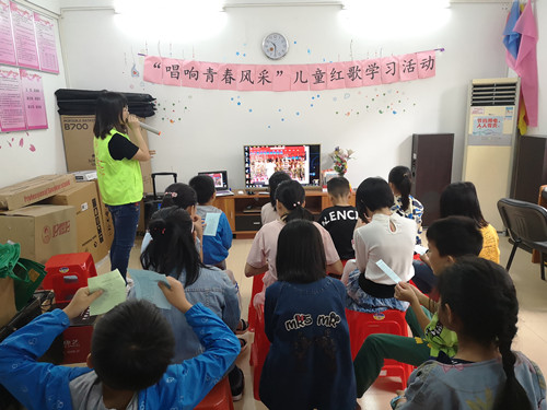 迅速活跃了起来。随后,社工通过播放视频,一起简单了解五四青年节的来历并巩固小朋友们的知识。社工不仅播放了小朋友熟悉的《义勇军进行曲》、《让我们荡起双桨》等红歌,唤起小朋友们学习过的记忆,还教导一起学习《团结就是力量》、《当那一天来临》两首曲子。小朋友在学唱过程中,精神饱满,朝气蓬勃,富有激情。在最后的分组对决中,小朋友们声音整齐响亮,富有感染力。