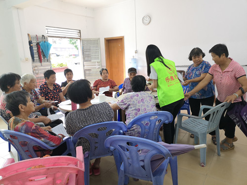 活动开始,社工一一为老人测量血压,并告知其血压值。血压测量结束后,社工向老人分发关于高血压的合理膳食宣传单,向他们普及高血压的相关知识,例如如何高血压的诱发因素,如何预防高血压,如何防治高血压,以及高血压的症状和并发症等等,老人们都听得非常认真。