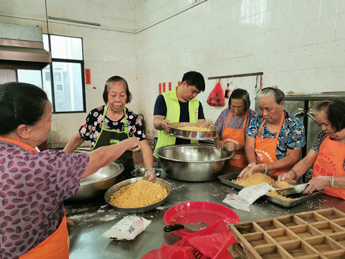 本次活动分为两个环节。第一个环节,社工和长者志愿者一起制作传统美食“番薯松糕”。活动当天早上,社工和长者志愿者早早就来到袁山贝喜宴堂的厨房开始准备。活动现场,长者志愿者们分工合作,一些长者志愿者负责将番薯和糯米粉混在一起做成松糕粉,一些长者志愿者负责将花生碎和白糖混在一起做成松糕馅。材料做备好后,将松糕粉和松糕馅按步骤的放到松糕夹中,最后将松糕放到锅中蒸30分钟,松糕就做好了,期间长者们有说有笑,经过三个多小时的努力,一盘盘香喷喷的“番薯松糕”就出炉了。长者们在享用美食的同时,分享起每期素食的有趣经历,每个人脸上都洋溢着欢欣的笑容。