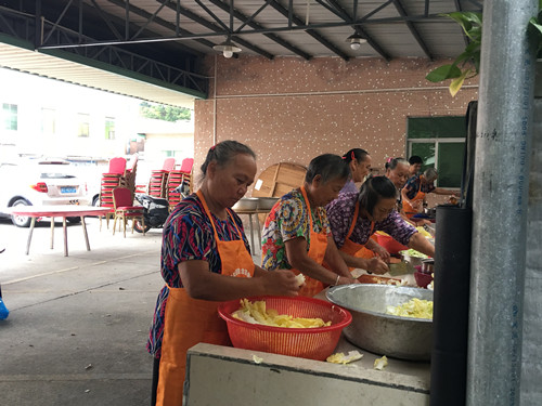 当天早上8:30分社工和志愿者一起前往警务区饭堂,随后,大家都纷纷地忙了起来,食材准备、刷锅、烧火、扫地、布置场地,大家各司其职有条不紊地做好自己手上的工作。待准备工作完成后,长者志愿者把材料分批处理,先是把大米粉调成糊状,再把炒好的娃娃菜、青豆、头菜、花生、水瓜、萝卜、芋头一起下锅,一边煮一边搅拌。经过大家一番努力,锅里传来一阵飘香,热腾腾的“咸糊”便要出炉了。社工和志愿者把咸糊装在多个小盆里并为长者们呈上。长者细细地咀嚼品尝并称赞道,咸糊是他们袁山贝的一道传统美食,很合他们胃口,他们很喜欢”。