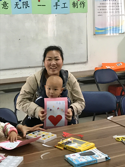 活动分为三个环节。首先,社工首先向亲子家庭介绍本次活动的主要内容,并向参加活动的所有妇女表示节日的祝福,接着带领亲子家庭进行游戏-我的宝宝在哪里,活跃现场的气氛,轻松愉悦的游戏互动环节过后,是本次活动的主题环节—亲子手工制作,每对亲子认真地听完社工的活动事项安排之后,开始动手制作手工卡片。漂亮的手工作品在亲子的共同努力之下,很快就展现在大家的面前。