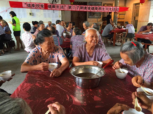 早上9时许,长者志愿者就已经来到饭堂帮忙了,社工安心地把煮八宝粥的任务交给她们,这样社工就可以抽身出来布置现场;社工与志愿者分工明确、有条不紊地忙碌着。在等待八宝粥出锅的这段时间里,社工向参加活动的村民讲解了一些健康知识,村民们听得很认真,部分村民遇到不懂的地方还会向社工提问。经过志愿者几个小时的“奋斗”后,八宝粥终于出锅了。村民表示在这炎炎夏日,吃一碗清凉的八宝粥是一个不错的选择。大家围坐在一起,品尝着八宝粥,聊聊家常,场面温馨和谐,其乐融融。