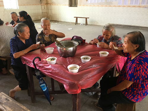 早上9时许,社工们就准备好物资,出发到达了十队饭堂。长者志愿者也是早早就来到十队饭堂帮忙。活动现场,工作人员有条不紊的按照事前的安排进行工作,有的布置场地和摆放桌椅,有的协助长者志愿者处理食材,有的组织参加者签到和安排入座。经过工作人员和长者志愿者半个小时的努力,食材都被处理好了,接着工作人员将食材倒进了锅里。经过一个多小时的烹煮之后,香喷喷的蔬菜粥终于煲好了。随后,工作人员用盘子将煲好的蔬菜粥盛起来,待参加者准备来齐的时候,工作人员分发一次性碗和汤匙,并将蔬菜粥放到桌子上供参加者食用。很多参加者都表示:蔬菜粥既健康又美味。