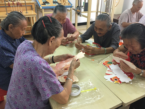 活动以本土中秋传统习俗为话题展开,随后为了激发社区老人的参与热情,社工现场与社区老人玩起了“灯谜咕咕下”的热身游戏。一开始由社工出题目让老人们举手抢答,到了后面,便由老人自己出题目来考别人,活动现场充满了欢声笑语。欢乐的猜谜语后,便是DIY灯笼环节,在这个环节里,社区老人们分为4组坐下,在志愿者的指导下开始制作灯笼。拆开包装、拼接,再细心的贴上胶纸,粘上各种装饰品,最终一个个漂亮的灯笼就在老人的手中诞生了。