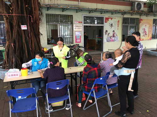 虽然季节来到秋季,天气较为凉爽,但是活动刚开始,现场人流已经络绎不绝了。活动现场,社工组织群众有序地到签到处拿取义诊卡,接着进行各项检查。袁山贝社区卫生站的医护人员为社区群众进行血压、血糖的测量,并详细询问群众的身体状况,耐心地为他们进行检查,分析病情、讲解注意事项,认真解答群众关于生活中的一些常见疾病以及健康保健问题。