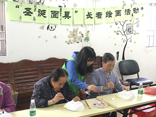活动开始,社工首先介绍圣诞节的由来,增加长者对西方圣诞节的认识。在通过“传雪球”游戏活跃了现场气氛后,进入今天主题,制造属于自己的圣诞面具。在制作环节中,工作人员向长者们展示了样品,长者看到样品都表示自己不会制作。工作人员鼓励长者,肯定他们的动手能力,并一直在旁耐心协助。在工作人员的耐心、细致的指导下有些长者画出了黑头发黄皮肤,十分有中国特色的圣诞老人面具;有些老人十分随性地将帽子涂绿;还有些老人就照样品画出白头发白眉毛传统的圣诞老人。活动结束,陈叔还没等颜料干透就迫不及待就戴了起来,还表示:“参加社区的活动非常开心,以后会经常参加”。