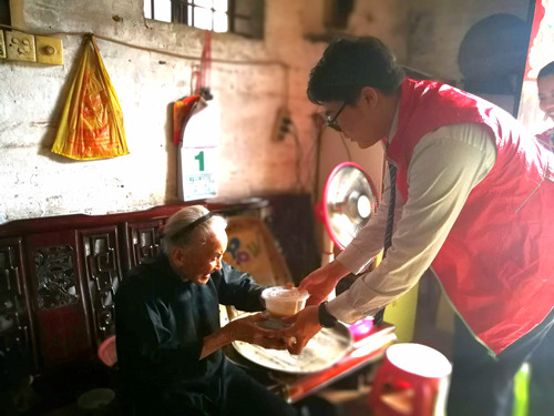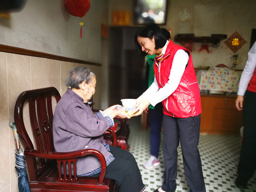 随着开水的沸腾、糖的融化、汤圆一颗颗的煮熟,再加上打发好的鸡蛋,美味的汤圆就可以出锅了。在送餐的志愿服务队的义工和社工的共同努力下,一碗碗汤圆打包完成,并相对应分装,让送餐的服务队的志愿者派发给社区的老人。来到林婆婆家送汤圆,婆婆对社工、志愿者的到来感到很开心,在尝过美味的汤圆后,表示:“你们真有心哦,我一个人住又没有人关心,很多节日你们都记得我,汤圆好好吃,我好开心。”