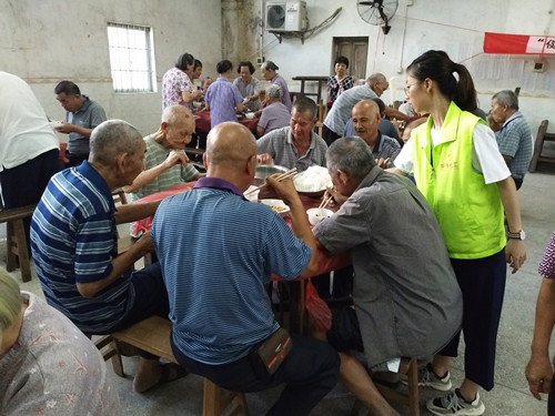 11点多,一盆盆捞米粉陆陆续续上桌,社区村民一边吃着米粉一边跟旁边的人说笑,整个十队饭堂弥漫着温馨、热闹的气息。
