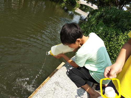 社工带着亲子拎着一桶桶环保酵素来到四甲陈屋基河边,社工讲解了环保酵素的净水作用和投放河水时的注意事项等。接着家长带着年龄偏大的孩子在河涌到进行污水点取样,小朋友拿着社工派发的ph值试纸放入污水样本中进行测试,测出ph值为7,河水属于不健康。随后亲子很专心地一杯一杯把环保酵素投放入河流,并露出满足的笑容。接着我们迎着阳光来到户外,在社区的绿道上收拾着垃圾。有些孩子说到:好多垃圾,这里有,这里也有一个,我们要捡干净一点。让四甲更美丽!”