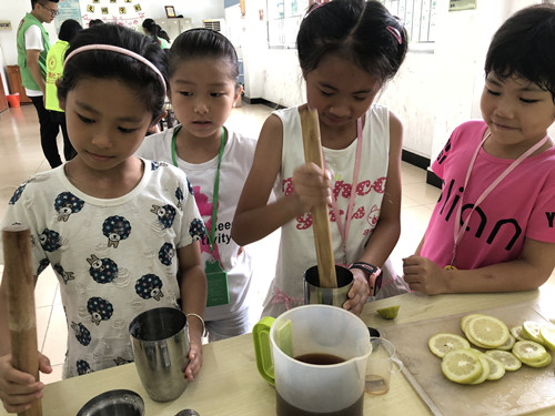 夏令营时光已过去一大半,老人和小孩在中心相处融洽,工作人员通过甜品分享活动促进老少互动。活动前,各组工作人员为成员们讲解了制作流程、安全注意事项以及活动意义。活动开始后,大家都迫不及待地动起手做牛奶小方块,分工有序、默契配合,有的负责称量牛奶和白砂糖,有的负责制作牛奶和淀粉的混合物,所有材料准备好之后就可以交给负责熬制的小伙伴,大家围绕着电磁炉观察混合物的变化,不时还交流看法。紧接下来就是制作芋圆糖水,孩子们负责把煮熟的紫薯泥和南瓜泥添入木薯粉揉搓成芋圆,然后交给工作人员进一步烹饪。随后,学员们满怀热情地把糖水和甜品交到社区老人手中,与他们一起分享,老人纷纷称赞小朋友有爱心,甜品也很好吃,学员们也感受到制作的乐趣和敬老的意义。(文/萧柏升)