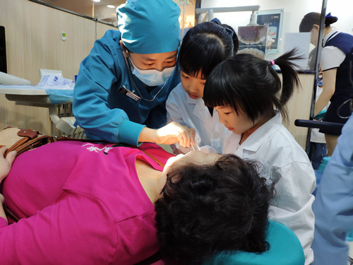 活动现场,牙科医生先是播放了关于爱牙护牙的动画片,以此告诉孩子们为什么要爱护牙齿和刷牙的作用。紧接着是通过PPT授课向孩子们讲授了有关牙齿构造、牙病表现与预防等知识,并现场教授同学们如何正确刷牙、如何爱护牙齿。还在牙科医生的指导下进行“我是小牙医”职业体验,首先是医生现场免费给宝宝检查牙齿,然后是穿上白大褂的孩子们轮流扮演小医生角色在医生指导下给爸爸、妈妈检查牙齿。在医生的指导下完成了口腔检查,在检查过程中与家长进行交流和沟通,提高对口腔健康保护意识和儿童的社会实践能力。