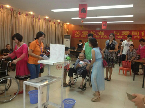 活动共分三个环节:热身游戏,节目表演和礼物派发。首先,活动在简单有趣的投篮比赛中拉开帷幕,有趣的游戏吸引了每位老人的参与。然后,老人歌舞队和爱心志愿者们为老人准备了精彩的歌舞表演,精彩的节目表演获得了老人的阵阵掌声与赞扬。最后,活动为每位老人派发生日礼物。老人们拿着游戏奖品和生日礼物,纷纷表示自己感到非常开心 ,有位老人更是唱了一曲山歌以示感谢。
