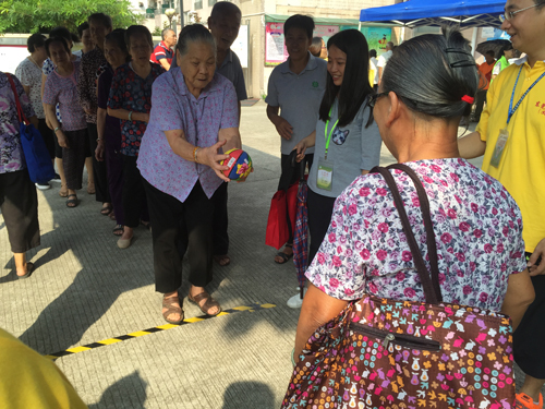 由社区开心广场舞带来的《热辣辣》和《 舞动中国》两支欢快的舞蹈拉开了本场趣味运动会的序幕。本场趣味运动会共设置了趣味高尔夫、弹皮球、拉宝藏、小圈套大圈这四个游戏摊位。其中“趣味高尔夫”和“ 拉宝藏”这两个游戏吸引了众多的老年人排队参与,在“趣味高尔夫”游戏当中,老人目不转睛地盯着目标箱,奋力一掷,在大家和志愿者的欢呼声中,球稳稳地“溜”进了目标箱内,赢得周围的阵阵掌声。值得一提的是,本次趣味运动会得到永和豆浆的大力赞助和支持,老人参与游戏结束后不仅可以兑换精美小礼品,还可以喝上一杯暖暖的豆浆,最后运动会在大家的一片欢笑声中圆满结束。