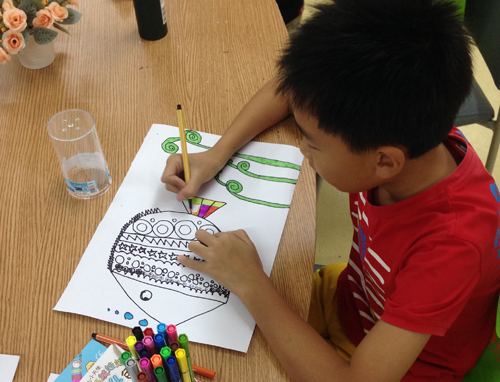 而儿童画课上,老师布置的的主题是“海洋世界”。学员们发挥各自的创新思维和想象力,创造出一个属于自己的海洋世界!先要“造”出鱼的外形,海草、气泡等海底装饰必不可少!最后写上自己的名字,这个美妙的海洋世界就真正属于自己的啦!!
