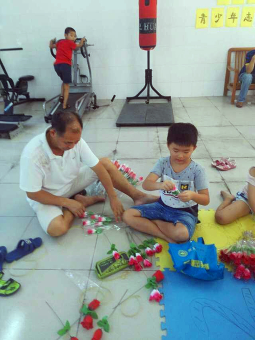 学校社工悉心为青少年准备了仿真花材料、包装套管、彩带、剪刀等工具。家长们在一旁剪好一条条的丝带,孩子们鼓足干劲地整理花束、包装花朵,三朵成一束,整节活动下来,孩子们在与家长的共同努力之下完成了630朵花,共210份礼物。在花朵的整理、包装过程中,孩子们也遇到了小小的困难:不会扎蝴蝶结。能克服的困难都不是困难,在妈妈、爷爷以及社工的一次次示范跟纠正下,最后,他们都能够给自己做的花束绑上一个大大的、形态各异的蝴蝶结。孩子们专注、认真的表情构成了一副美丽的画面。