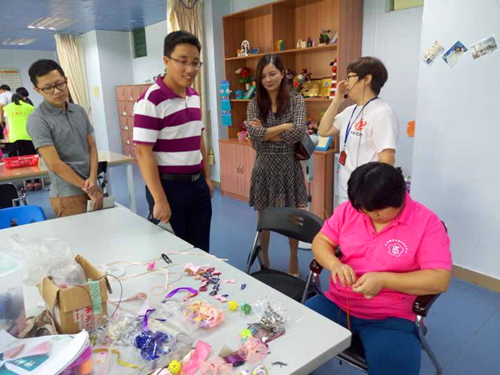 中心社工负责人带领调研组参观中心职业康复室、职业评估室、个案接待室、研发产品展示厅、模拟车间等功能室,并向调研组介绍了中心四大特色服务,如园艺治疗项目,目前中心园艺服务已经进入第二阶段的发展,学员通过参与园艺训练,从中获得乐趣,自信心和成就感都有所提升;研发产品项目,目前中心以头饰、数字油画、绘画工艺为主打研发产品,提升学员动手能力的同时以义卖增加学员收入;学员导师制度,学员导师在基础服务中发挥重要作用,自身能力明显提升;同时,中心还拓展社区康复服务,以康就中心为平台,联合石碣各村社综针对困难残疾人、精神障碍人士与普通残疾人士开展社工服务。调研组对中心特色服务表示赞许,并在参观过程中与学员热情交流,对学员精神面貌给予高度好评。