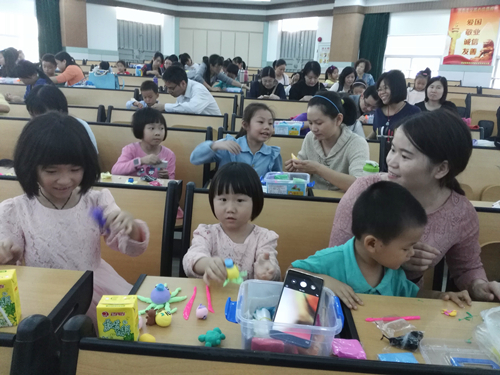 活动现场,小朋友们跟随着爸爸妈妈首先拿着教学小册子观察、学习如何将一块块的黏土,变成一个个生动可爱的小动物,然后拿到了材料的小朋友纷纷开始了自己的创作之旅;一段时间过去了,有的小朋友做了一个可爱的南瓜宝宝;有的小朋友在跟爸爸的共同努力下做好了一个带着帽子的章鱼娃娃;也有的小朋友们相互合作,完成了一个小小的动物园,里面有抱着竹子的大熊猫,长长的花斑蛇,可爱的小熊,还有一只萌萌的小白兔......活动快要结束了,小朋友们把自己做的最好的作品,整齐地摆放在桌面上,大家相互参观、交流,每一个小作品蕴藏着小朋友与家长之间爱的交流。