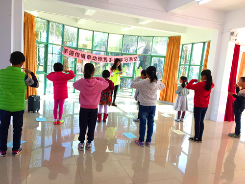 手语学习先从简单的手语开始,“爸爸、妈妈、哥哥、姐姐、弟弟、妹妹、你好......”这些手语也是比较常用的,有手语基础的小朋友很快就掌握了动作。接着才学习手语《让爱传出去》,“爱是看不见的语言,爱是摸不到的感觉,爱是我们小小的心愿,希望你平安快乐永远......”随着音乐的响起,小朋友们忍不住跟着音乐哼了起来,工作者鼓励小朋友唱出来,在学手语的时候也要一边唱一边做动作,这样有助于记牢动作。经过一个多小时的学习,小朋友已经掌握基本动作,整个学习过程十分顺利。
