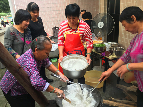 早上七点余,准备做迎冬美食——菜角的老人早早到场,她们默契又熟练地分工协作干起活来,刨萝卜、炒腊肉、搓粉、起柴火.....,一道道工序,有条不紊进行,一群高龄老人与中年妇女有说有笑,毫无年龄差与遗和感。一位80多岁的陈婆婆感叹道:“好久没有大家一起干活了,很怀念以前穷苦的子日,有事相互帮忙,有饭大家一起吃!”