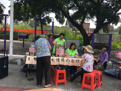 炎热的夏日,猛烈的太阳占据天空。为关爱辖区一线的环卫工人,提醒他们注意身体健康,预防高温中暑,2019年9月11日下午,水南社区综合服务中心开展“关爱马路天使,我们在行动”——为环卫工人送清凉活动,以定点在水南家仁村篮球场和走访的形式,为正在工作的环卫工和辛勤工作后的环卫工人们派送凉茶、糖水,表达社区对他们的关爱和感恩之情。
