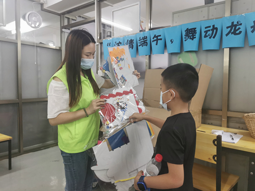活动中,社工首先给孩子们介绍了端午节的龙舟风俗来源和寓意,以及做龙舟的基本方法和技巧,让大家了解制作的整个过程。孩子们在家长的配合下充分发挥自己的想象力,上色、粘贴以及拼接龙舟模型。不一会儿,一艘艘五彩缤纷、创意满满的龙舟就呈现在大家面前,孩子们相互欣赏着各自的作品,乐得合不拢嘴。
