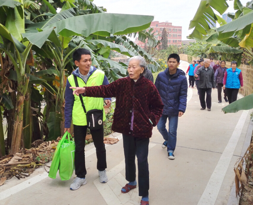 活动开始,社工为老人详细讲解“微旅游”路线和注意事项,随后社工和护工陪同老人开始出游。藉着“微旅游”这样的沟通平台,在游览的途中,多年不见的老街坊一路上聊得很欢,谈笑风生。有老人对社工说:“自己平时一个人都不敢出门,现在终于能到村里走走了,还有这么一群老街坊陪着呢”。路上遇到熟人,老人都很高兴对他们说道:“社工带我们到村里走走,好开心啊。”而当老人看到村里熟悉的景物时,他们也向大家说起了历史和介绍周边的发展变化,他们表现的是喜悦以及对乡村发展的肯定。回到出发点,在短暂的休息后,社工带领老人玩了游戏“寸步好行”和“搬运气球”。在游戏中,老人重拾了童心,玩得不亦乐乎,引起了很多村名的围观和赞美。