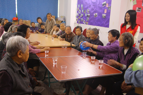 活动以老人代表回忆青春往事为开端,向社工和志愿者叙述当年的往事,接着,志愿者献唱怀旧歌曲,在熟悉的歌曲伴奏下,老人们也跟着志愿者哼唱起来。随后,通过击鼓传花的游戏来选取老人进行“你比我猜”游戏,志愿者借助动作来表达词语,老人靠动作来猜词语。该游戏掀起了活动的一个小高潮,逗得现场老人们很开心。最后,活动以志愿者和老人齐唱“外来媳妇本地郎”的主题曲结束活动。